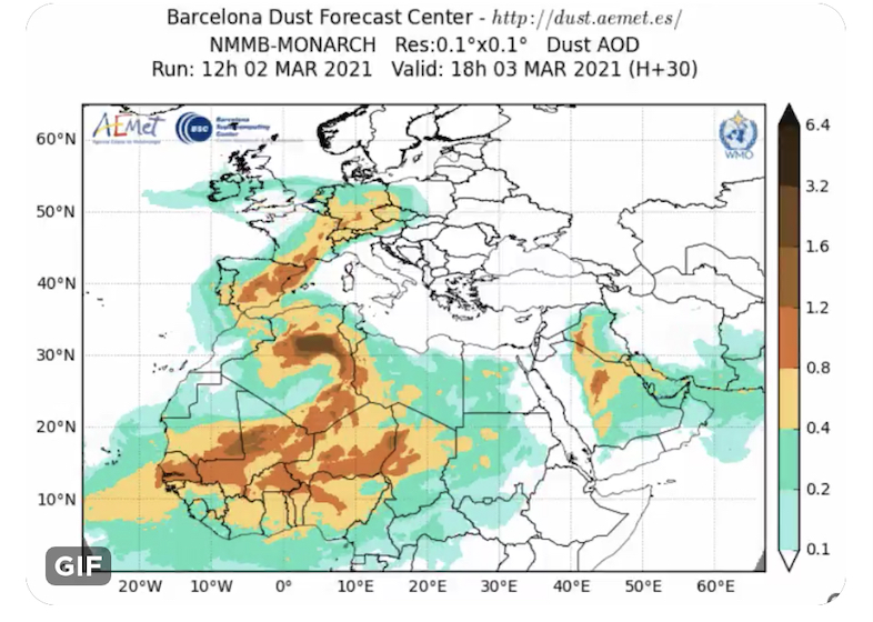 En los primeros meses de 2021, diversos episodios de calima se han desplegado sobre la península ibérica. Este fenómeno atmosférico se produce cuando se arrastran partículas del desierto del Sáhara por las capas medias de la atmósfera y se diseminan a miles de kilómetros de distancia a merced de las corrientes de aire. Se acompaña de vientos fuertes, temperaturas elevadas y sequedad del aire.